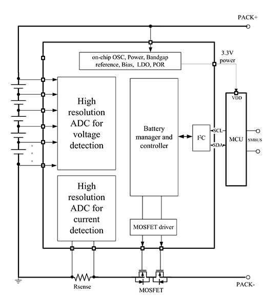 HSM12X0 系列芯片可作為3-15 節(jié)串聯(lián)電池組監(jiān)控和保護(hù)解決方案的一部分。通過(guò)I2C 通信,MCU 可以使用HSM12X0 來(lái)執(zhí)行電池管理功能,例如監(jiān)測(cè)(電池電壓、電池組電流、電池組溫度)、保護(hù)(控制充電/放電FET)以及電池組均衡功能等。集成的模數(shù)轉(zhuǎn)換器可實(shí)現(xiàn)MCU 對(duì)電池組關(guān)鍵參數(shù)(電壓、電流以及溫度)的純數(shù)字讀取,這些參數(shù)的校準(zhǔn)在制造過(guò)程中處理。HSM12X0 在設(shè)計(jì)時(shí)充分考慮了低功耗要求,既可通過(guò)使能/禁用集成電路IC 中的子模塊來(lái)控制整個(gè)芯片的功耗,又可以利用SHIP 模式將電池組切換至超低功耗狀態(tài)。