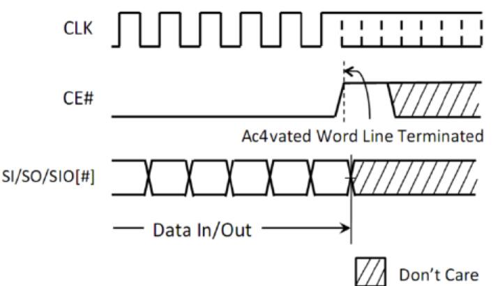 所有所有讀和寫都必須由CE#從低到高完成。CK#的上升沿是終止已激活的讀/寫字線并將設(shè)備設(shè)置為待機狀態(tài)的觸發(fā)器,否則將阻止內(nèi)部刷新操作,直到設(shè)備看到讀/寫字線已終止,無需執(zhí)行命令終止操作僅適用于讀取和寫入操作以及任何命令操作,例如Enter Quad模式命令和Reset命令。