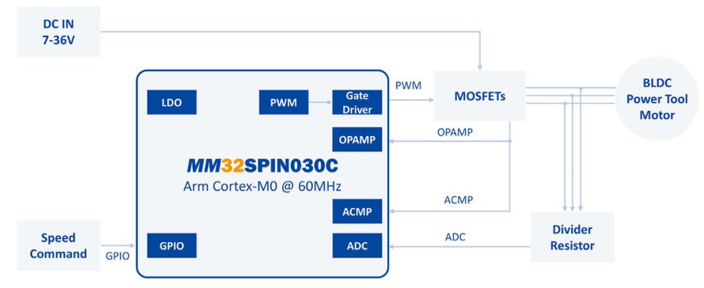 MM32SPIN030C,Arm® Cortex-M0內核,最高工作頻率可達60MHz,內置存儲器32KB Flash和4KB SRAM,具有1 路 12 位模數轉換器 ADC,支持 11 通道,采樣速率 1Msps,4 個通用定時器,1 個針對電機控制的 PWM 高級定時器,支持 UART/SPI 通信,針對電機應用內置 2 個運放、2 個比較器,內置三相 P/N 柵極驅動器。