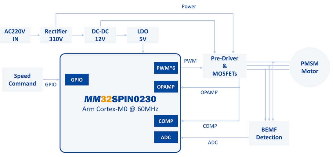 MM32SPIN0230,它采用Arm® Cortex-M0內核,最高工作頻率可達60MHz,內置32KB Flash和4KB SRAM,具備1路12位模數轉換器ADC,支持11通道,采樣速率達1Msps,以及4個通用定時器和1個專為電機控制設計的PWM高級定時器。此外,它還支持UART/SPI通信,并內置2個運放、2個比較器,專為電機應用而設計。