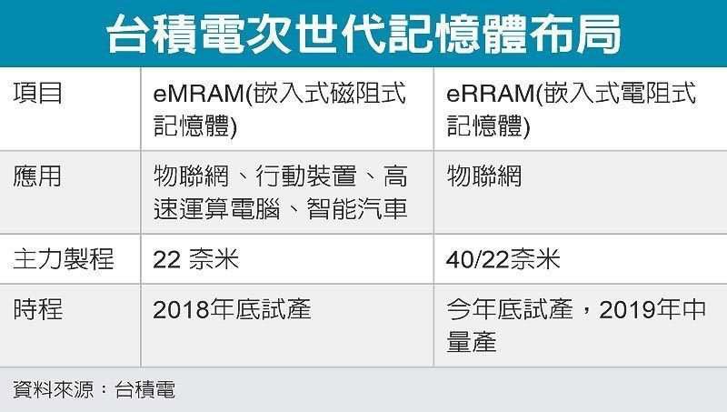 臺積電技術(shù)長孫元成近日在臺積電技術(shù)論壇上,第一次披露臺積電研發(fā)多年的eMRAM(嵌入式磁阻式隨機(jī)存取內(nèi)存)和eRRAM(嵌入式電阻式內(nèi)存),分別定于明后年實(shí)行風(fēng)險性試產(chǎn),主要使用22mn制程,這將是臺積電因應(yīng)高速運(yùn)算計算機(jī)、物聯(lián)網(wǎng)、行動裝置和智能汽車等四領(lǐng)域所供給效能更迅速和耗電更低的新內(nèi)存。