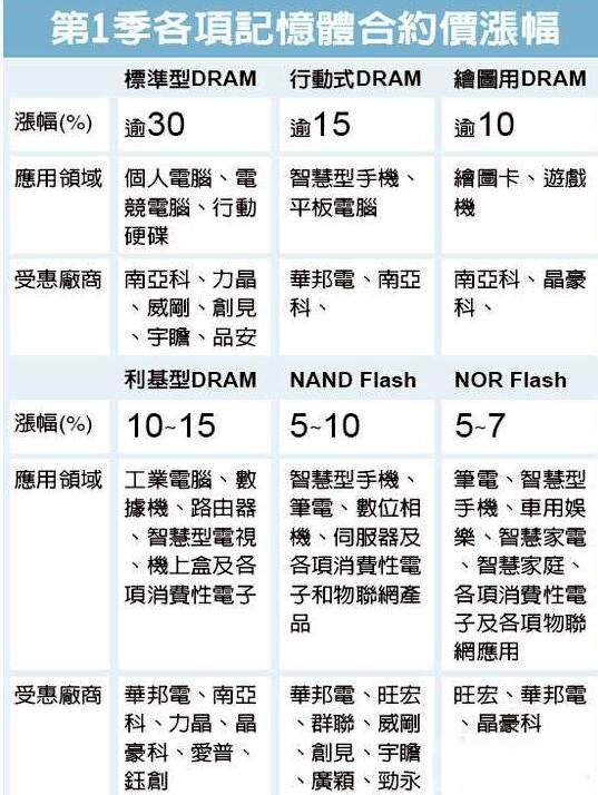 今年存儲(chǔ)芯片缺貨效應(yīng)持續(xù)擴(kuò)大,繼DRAM、儲(chǔ)存型快閃存儲(chǔ)(NAND Flash)在淡季飆出歷年最大漲幅后,編碼型快閃存儲(chǔ)(NOR Flash)也在睽違四年多來初次提價(jià),第一季度調(diào)漲5~7%不等,下季漲幅更大,估計(jì)漲幅逾10%。