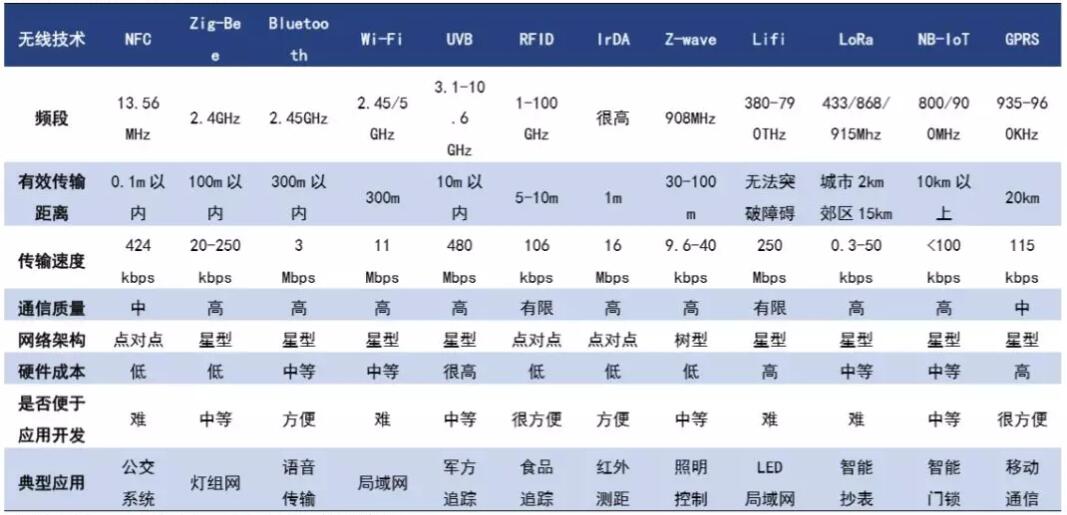 無線通信技術主要分廣域網和局域網兩種,具體差別在傳輸距離和通信協議方面。局域網無線通信技術包括、WIFI、藍牙、ZigBee、UWB、RFID、LiFi等,傳輸一般在0-300米;廣域網無線通信技術包括GPRS、LoRa、NB-IoT等,有效傳輸距離在公里級。藍牙是最主要的局域網(短距離)無線通信方式之一,適合覆蓋距離在百米以內、數據傳輸量較小的通信。