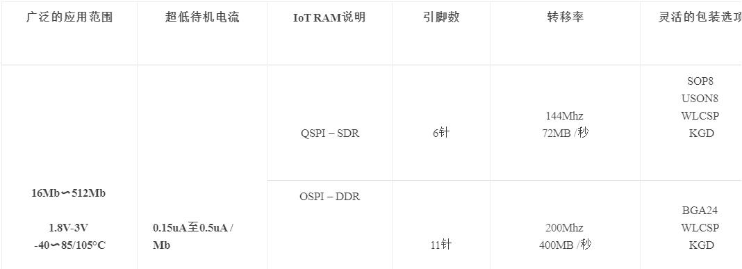 ram替換DRAM,消除了對外部刷新控制器的需求,這降低了接口的復雜性和相關的驗證成本,利用了外部SPI接口的使用,同時保持了最新IoT應用程序所要求的高性能水平,并降低整個系統的功耗。有些基于MCU的舊系統仍在使用SDRAM,在降低功耗和簡化接口方面,可以受益于IoT RAM的使用。下表清楚顯示了待機電流和有功電流的優點,同時保持了相當的傳輸速率。