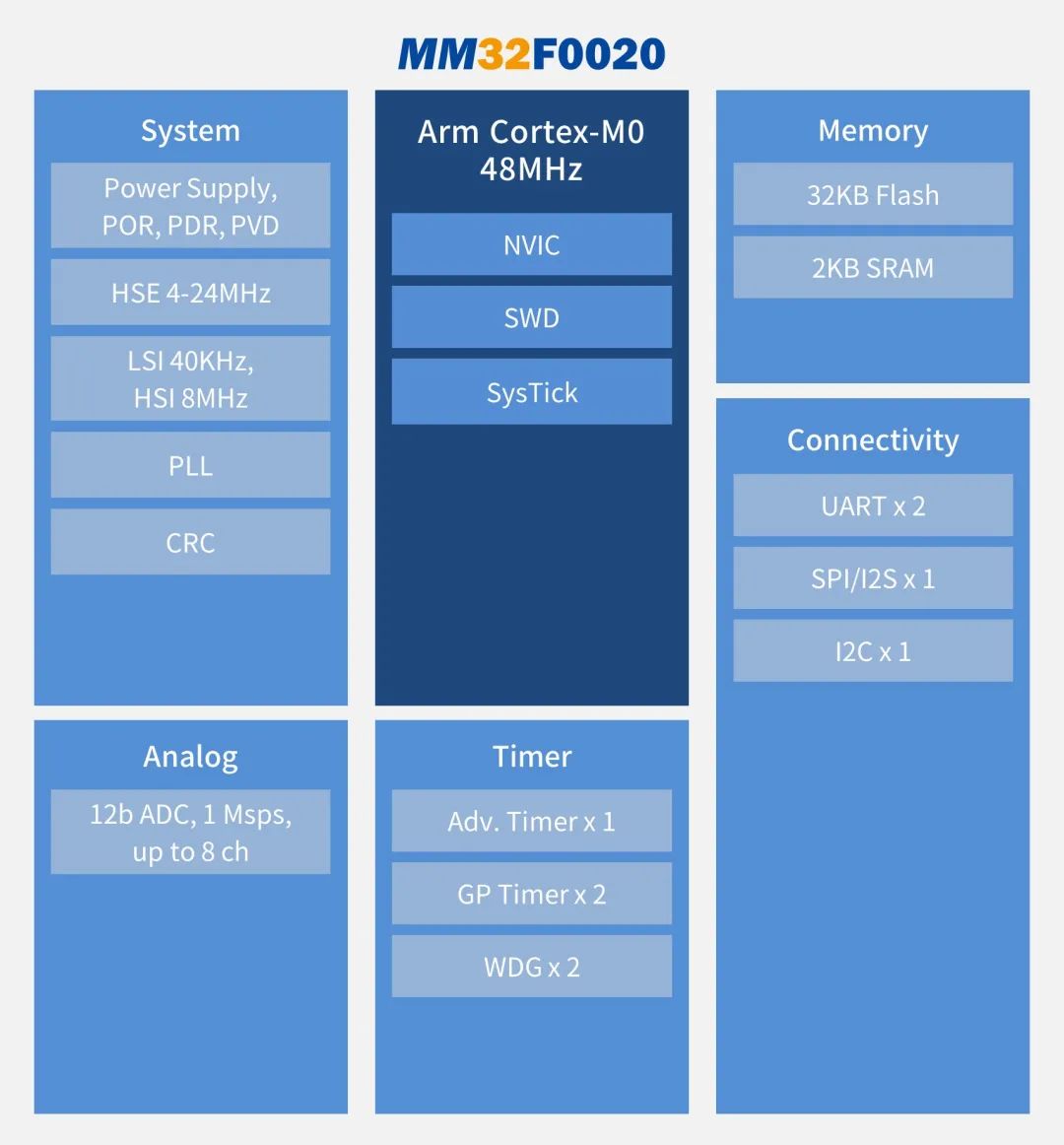 靈動微12寸晶圓打造的全新超值型M0內核的MM32F0020系列MCU。該系列32位MCU適用于各類工業、消費市場和汽車,典型應用包括充電器、電池管理、散熱風扇、煙感、玩具、電機以及8/16位MCU升級替換。